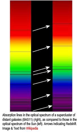 The wavelengths at which an element emits light are known. This is especially important in astronomy when studying stars — researchers examine the wavelengths of light emitted by a star. From this data, they can deduce which elements the star contains, as well as the concentration of those elements. When the observed wavelengths from a star are compared to a standard reference table, there is usually a shift. If the star is moving away, the wavelengths get longer (REDSHIFT) (see image on the right); if it is approaching, the wavelengths get shorter (BLUESHIFT). This shift is named the Doppler Effect in honor of Christian Doppler, who identified and adapted this phenomenon to physics.
