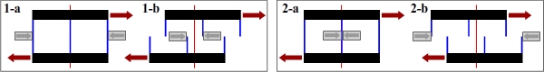 En la primera figura, las luces se emiten mientras los trineos avanzan hacia el eje de simetría.