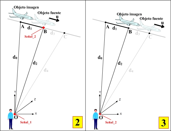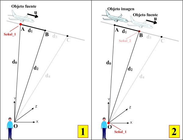 Cuando la señal llega al observador, el avión (Objeto Fuente) ha alcanzado el punto B.