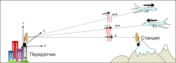 Предположим, что скорости самолётов одинаковы, но один из них приближается к передатчику, а другой удаляется.