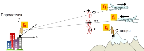 а приближающийся самолёт — на частоте f2.
