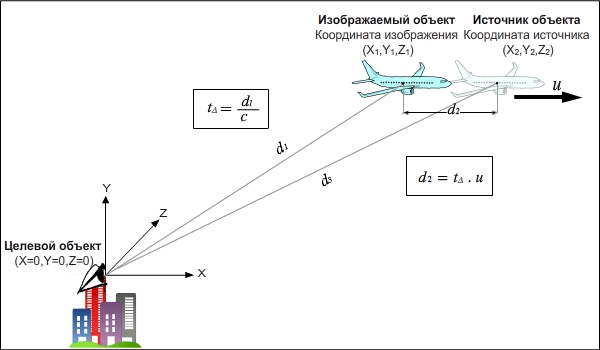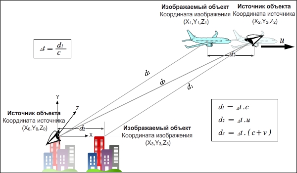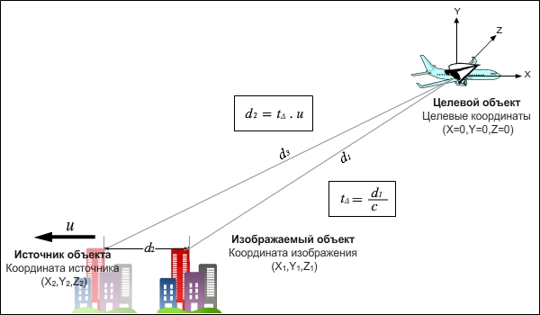 Когда сигнал достигает Целевого Объекта, то есть наблюдателя в самолете, находящегося в координатах (x=0,y=0,z=0), он видит Объект Изображения (изображение города). Координаты Объекта Изображения соответствуют координатам излученного сигнала (x1,y1,z1).