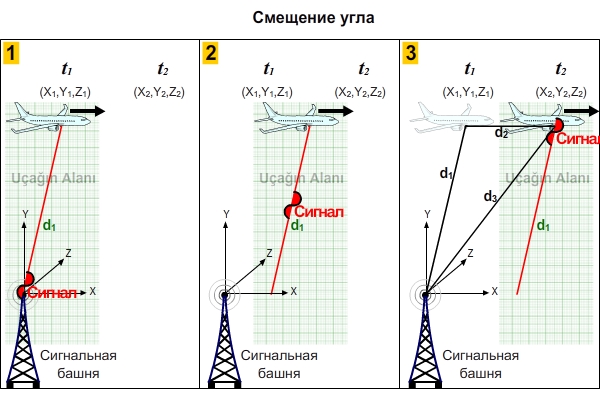 В первой клетке: Когда самолет находится в координатах (x1,y1,z1), сигнальная станция отправляет сигнал в его поле. Красная линия d1 является линией, принадлежащей полю самолета. Сигнал достигнет самолета, следуя этой линии.