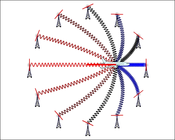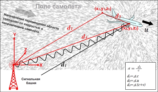 Следующая фигура показывает, как подвижная система отсчета принимает сигналы со всех 3600 градусов. Сигнальные башни передают сигнал на одной частоте и следят за целью. Чтобы сделать явление более наглядным, скорость самолета была установлена на значение c/2.