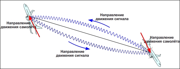 Ниже показано взаимодействие сигнала между двумя самолетами, которые удаляются друг от друга.