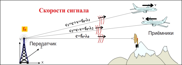 объект-цель удаляется от источника сигнала со скоростью v, то скорость