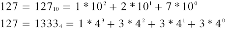 En los ejemplos se muestran los desarrollos del número 127 en base 10 y