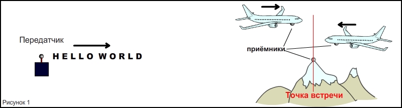 В этом примере рассматриваются два самолёта, летящих навстречу друг другу, гора и передатчик сигнала