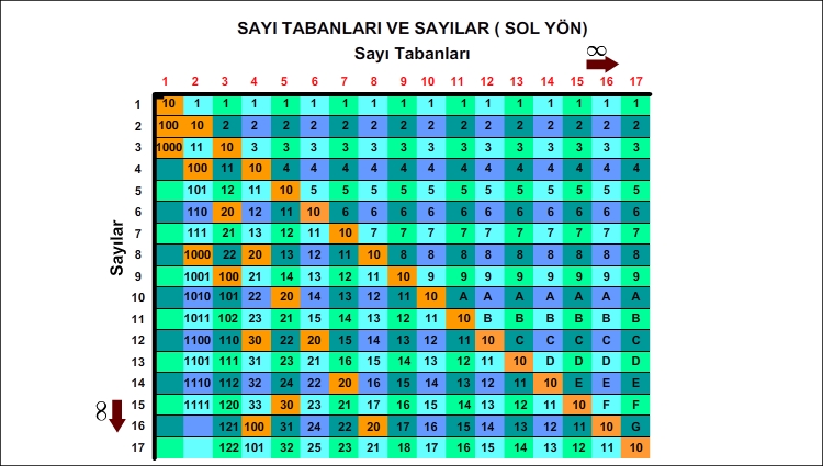 dizilimini göstermektedir. Normal olarak sayı tabanlarını ve sayıları