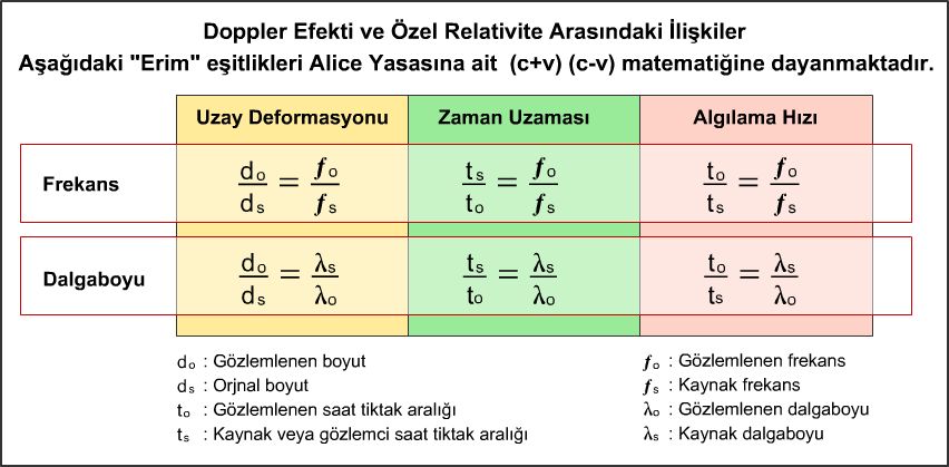 Doppler Etkisi neredeyse Özel Relativitenin bütün sonuçları ile direk olarak ilgilidir. Uzay büzülmesi, zaman uzaması ve eşzamanlılık (algılama hızı) dalgaboyu ve frekans değişimleriyle kolaylıkla ifade edilebilirler. Çünkü Özel Relativitede gözlemlenen bu olayların hepsi (c+v)(c-v) matematiğinin kurallarına göre oluşurlar ve bütün bu etkiler dalga boyu ve frekans değişimleriyle eş zamanlı olarak gerçekleşir. Alice Yasası Özel Relativitede gözlemlenen bu olayların, dalgaboyu ve frekans değişimleri ile olan ilişkisini bütün açıklığı ile gösterir. Aşağıdaki tabloya bakınız.